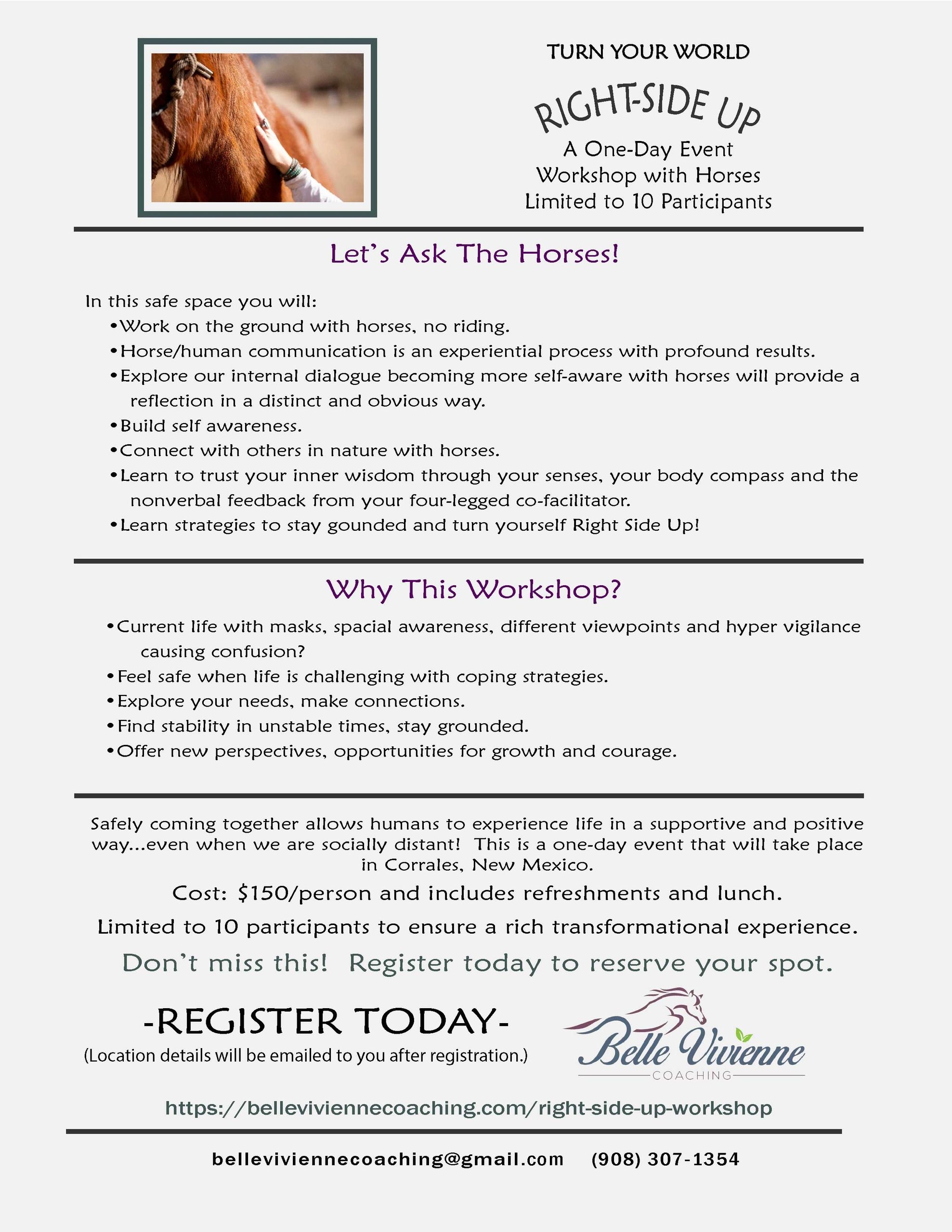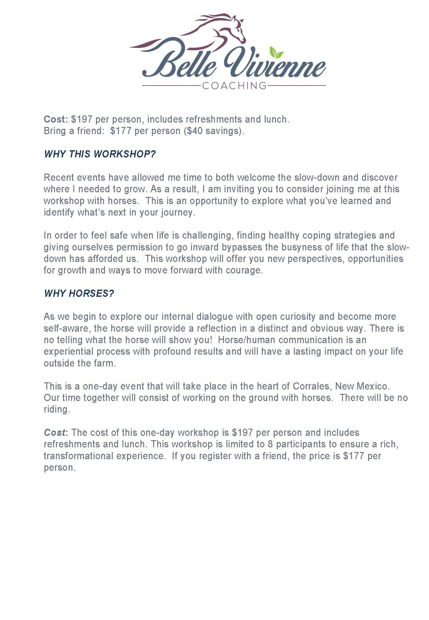 This is a one-day event that will take place in the heart of Corrales, New Mexico. Our time together will consist of working on the ground with horses. There will be no riding.